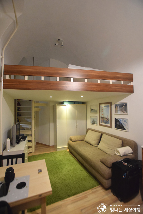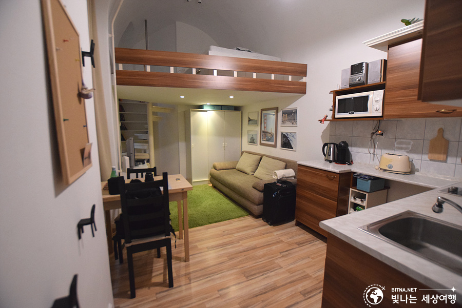 - 침실이 복층으로 분리된 스튜디오. 주방과 욕실, 세탁기, TV와 무선인터넷이 모두 포함되어 있다.