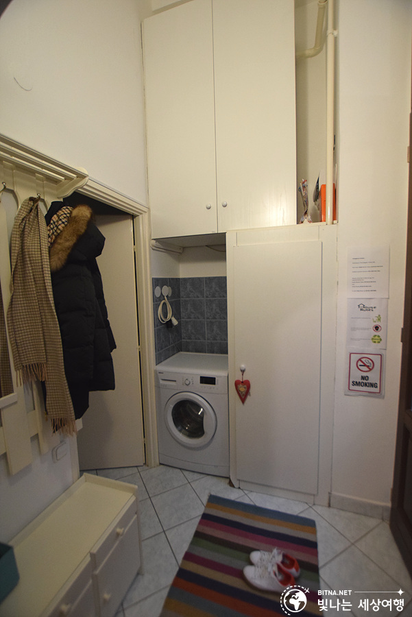 입구 쪽에 있는 욕실 역시 깔끔한 편. 한가지 아쉬운 점이 있다면 좁은 샤워공간에 있는 샤워커튼이었다. 샤워기를 틀면 샤워커튼이 자꾸만 몸에 달라붙어서 요령이 필요했으니까. 호스트에게 에어비앤비로 돈을 좀 모으면 샤워부스로 바꾸라고 조언해 주고 싶었다. ㅋㅋㅋ 청소기와 세탁기, 세탁세제와 욕실/주방 청소용품까지 모두 갖춰져있어 장기로 머물기에도 괜찮은 집이었다.
