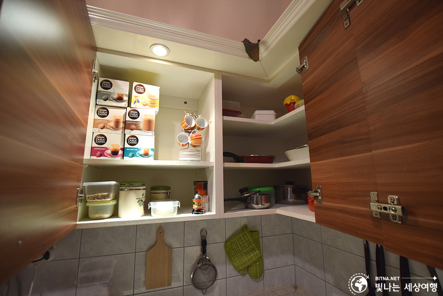 주방은 삼시세끼 셀프로 해결해도 될만큼 훌륭했다. 냄비와 후라이팬 등의 조리도구부터 그릇, 수저 등의 식기, 전자레인지와 토스터, 캡슐머신, 심지어 오븐까지 갖춰져 있었으니까. 이번 여행의 컨셉상 삼시세끼를 모두 밖에서 해결하긴 했지만 선반 가득 놓여있는 다양한 맛의 돌체구스토 캡슐은 매일 아침 나의 하루를 즐겁게 만들어줬다.