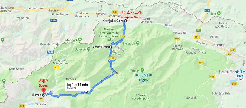 크란스카 고라에서 50km쯤 떨어진 마을 보베츠 Bovec로 가는 길, 우리는 조금 특별한 도로를 통과하기로 했다. '브르시크 패스 Vrsic Pass'라 불리는 이 길은 율리안 알프스에서 가장 높은 산악도로로 180도쯤 꺾이는 급커브가 무려 50개, 고도차는 1,000m쯤 된단다. 사정이 이러하니 20km쯤 되는 도로를 통과하는 것에 3시간이 소요된다는 말이 심한 과장은 아니겠군.
