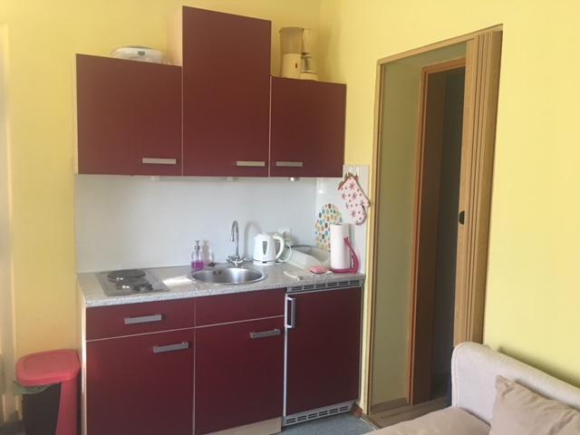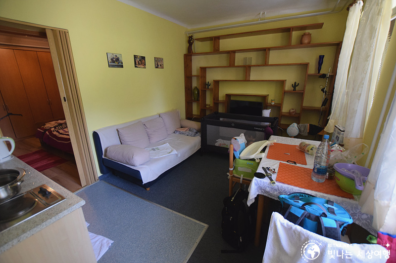 예약사이트 설명에서 살짝 애매했던 것이 이 숙소에 침실이 몇 개인가 하는 것이었다. 설명을 보면 침실이 두 개인듯 했는데, 사진상으로는 하나 뿐이었으니까. 결론은 거실 겸 주방 1개와 침실 1개, 즉 침실은 1개였다. (거실에 있는 소파가 침대로 변신가능한 것이라 오해를 산 듯) 거실 한 켠에 자리한 주방은 작지만 깨끗하고 조리도구와 식기들도 비교적 잘 갖춰져 있어 이유식 조리에 큰 어려움이 없었다. 어른 식사도 충분히 가능할 듯,