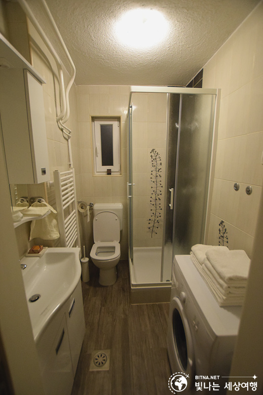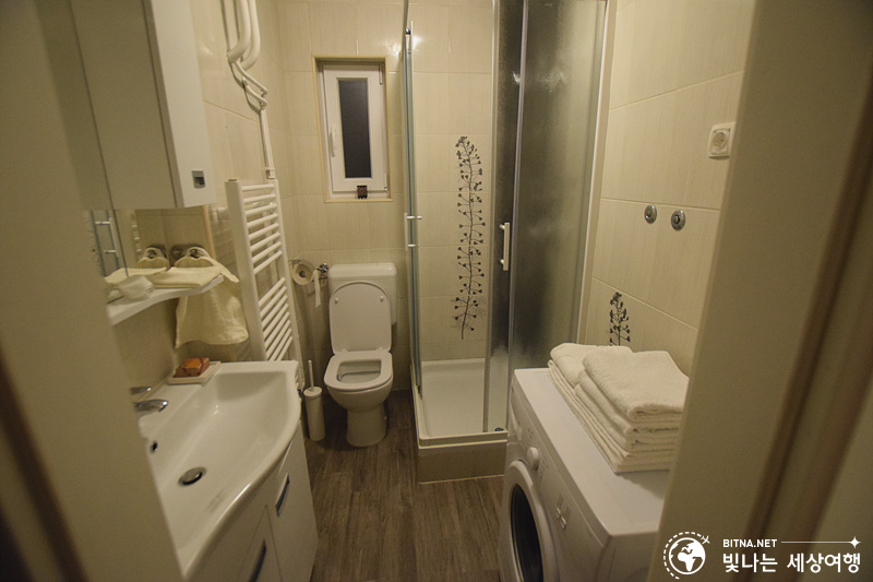 침실 안쪽에 자리한 욕실도 넓고 깨끗했다. 거실과 침실, 화장실이 연결되는 구조지만 침실과 욕실 사이에는 약간의 공간(복도)이 있어 생각보다 방음은 훌륭한 편이었다. 아, 세탁기가 있는 것도 장점.