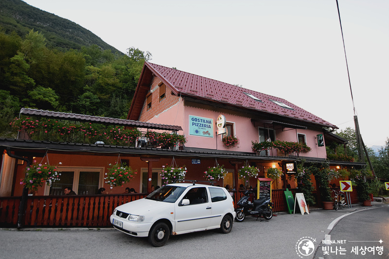 슬로베니아의 자랑 율리안 알프스를 관통하는 브르시크 Vrsic Pass 패스를 통과하고 나니 생각보다 더 시간이 늦어졌다. 많은 이들이 브르시크 패스가 끝나는 지점인 보베츠 Bovec에서 숙박을 하는데, 우리가 예약한 숙소는 보베츠보다 조금 더 남쪽에 있는 마을(Žaga)이었다. 뭐 멀어봐야 강변따라 달려서 몇 분 되지 않는 거리지만;