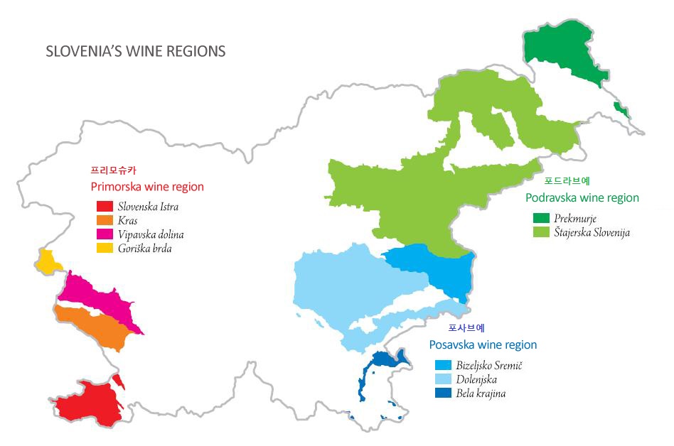 슬로베니아의 와인 생산지는 크게 세 곳으로 나뉜다. 가장 많은 생산량을 자랑하는 북동부 1) 포드라브예 Podravje (Podravska)는 화이트 와인을 주로 생산하며 스파클링 와인 같은 디저트 와인으로도 유명하다. 대표적인 도시는 세계에서 가장 오래된 포도나무가 있는 마리보르 Maribor로 여행 끄트머리에 방문하기로. (급히 일정에 낑겨넣음ㅋ) 이태리 국경과 인접한 2) 프리모슈카 Primorska 지역은 화이트 와인이 주를 이루나 일부 카르스트 지대에서 '테란 Teran'이란 이름의 짙고 드라이한 레드와인도 생산한다. 남동부의 3) 포사브예 Posavje (Posavska)는 레드와인으로 유명한 지역이다.